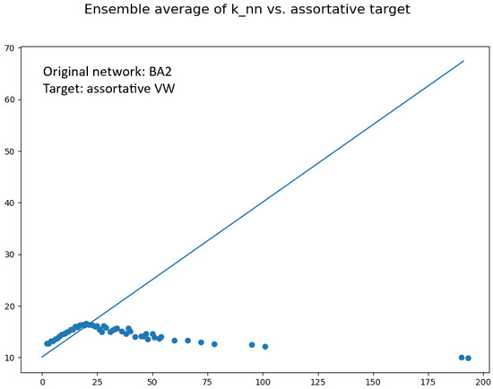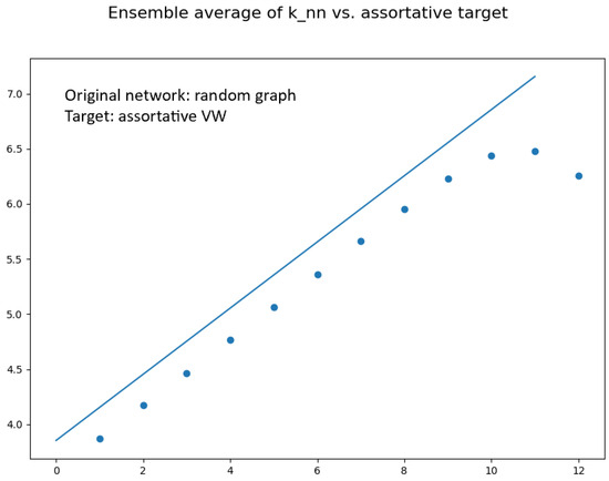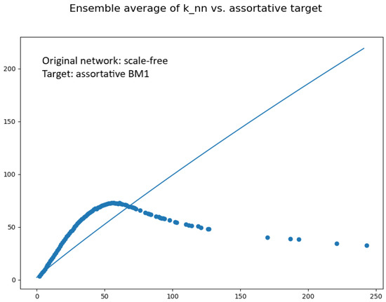 Before focusing on the case of scale-free networks, we notice that the rewiring procedure does work quite well for random networks. As seen from the examples in Figure 1 and Figure 2, one obtains, as an average in the ensemble of rewired networks, a  k ¯ n n ( k ) function which is linear like the target, except for large k. This deviation at large k was actually expected, as a consequence of the known “structural disassortativity” effect, due to the small number of hubs, which makes impossible for hubs to connect mainly to other hubs as required in principle by assortative correlations.