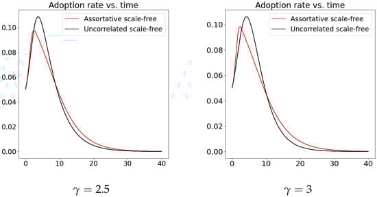 Figure 8. Total adoption rates as a function of time for a network Bass model running on uncorrelated and assortative scale-free networks with 1000 nodes (system of coupled differential equations for the single nodes).