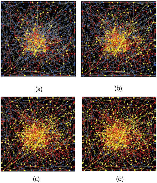 Figure 9. Some NetLogo views of the agent dynamics for Bass adoption in an assortative scale-free network. The agents that have not adopted are initially colored in blue, then “broadcast” (publicity) adoptions are represented by red color and “network” (imitation) adoptions by yellow color. The network has 500 nodes, γ = 2.5 and is obtained via Newman rewiring with a BM1 target matrix. The views are taken at approximate times (“ticks”) (a) 8, (b) 16, (c) 24, (d) 32, (e) 40, (f) 48.