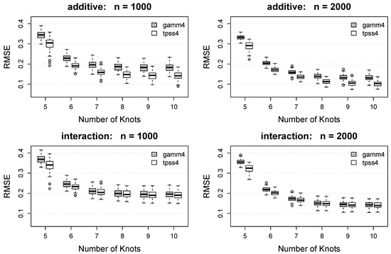 Box plots of the RMSE and MAE for each method under each combination of and are displayed in Figure 3 and Figure 4. As expected, both the RMSE and MAE decrease as the number of knots increases for both methods. For each , the proposed tpss4 method tends to result in smaller RMSE and MAE values compared to the gamm4 implementation. For the (misspecified) additive function, the benefit of the proposed approach is noteworthy and persists across all . For the interaction model, the benefit of the proposed tpss4 approach is particularly noticeable for small , but is still existent for larger numbers of knots.