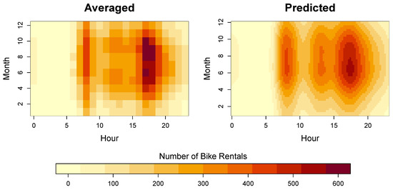 Looking at the bike rental patterns by hour of the day, it is evident that there are two surges in the number of rentals: (1) during the morning rush hour (∼8:00–9:00) and (2) during the evening rush hour (∼17:00–18:00). The results also reveal another (smaller) surge that occurs during the lunch hour (∼12:00–13:00). Interestingly, the predictions in Figure 6 reveal that the bike rental surge during the morning rush hour is more localized in time (lasting about one hour), whereas the evening surge is more temporally diffuse (lasting 2–3 h). The bike rentals tend to peak during the afternoon rush hour, and are at their lowest expected value during the evening hours (∼23:00–06:00).