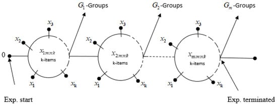 The PFFC scheme can be described as follows: suppose there are n independent groups, each with k items, these are placed on a life test, and we have a prespecified number of observed failures m and a prefixed progressive censoring plan , where () are the prefixed number of groups without item failure to be removed at i-th failure such that . In other words, the test will be terminated when the m-th failure is observed. When the first failure occurs at time , groups without item failure and the group where the first failure is observed are removed from the experiment. When the second failure occurs at time , groups without item failure and the group containing the second failure are removed from the experiment, and so on. Finally, when the m-th failure occurs at time , the remaining groups without item failure and the group containing m-th failure are removed from the experiment. Consequently, the observed failure times, , are called progressively first-failure censored order statistics with the progressive censoring plan . Figure 1 represents the schematic diagram of the PFFC scheme. Note that the PFFC scheme bears the following special cases: (i) it reduces to a complete sample case when and ; (ii) it reduces to a conventional Type-II censoring plan, if and , and ; (iii) it becomes a progressive Type-II censoring plan when , and (iv) it reduces to a first-failure censoring plan, when and . Moreover, the applicability or practicality of PFFC may be a particular setup of a parallel-series system in which n homogeneous system like a batch of electric bulbs are connected parallel, each batch has k bulbs or electronics components connected in series. For the testing procedures or collecting lifetimes, the same mechanism presented in Figure 1 can be used.