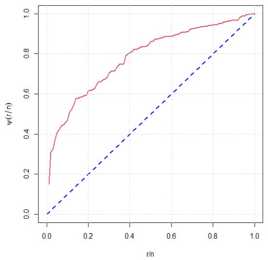 where represent the i-th order statistic of the sample. If the plot is convex (concave), the failure rate function has a decreasing (increasing) shape. For more details about scaled TTT transform, see, for example, Mudholkar et al. [52]. The scaled TTT plot of the data set in Table 6 is displayed in Figure 2. Figure 2 shows that the considered data set follows an increasing failure rate function. This empirical behavior of the failure rate function indicates that the MWD model can be considered a suitable model for this data set.