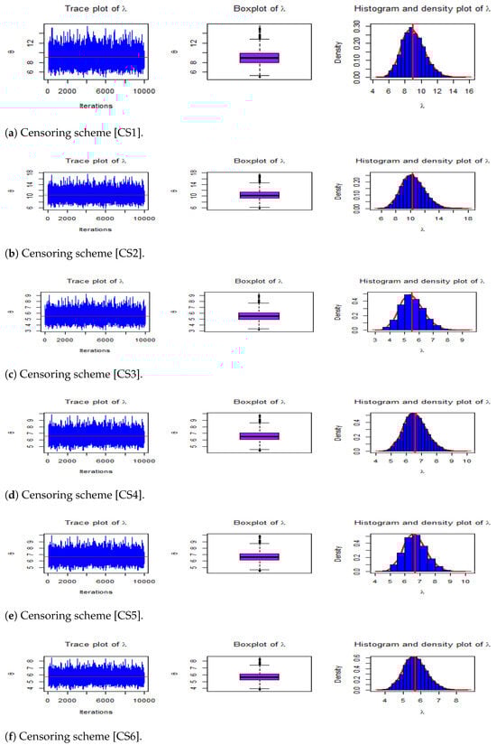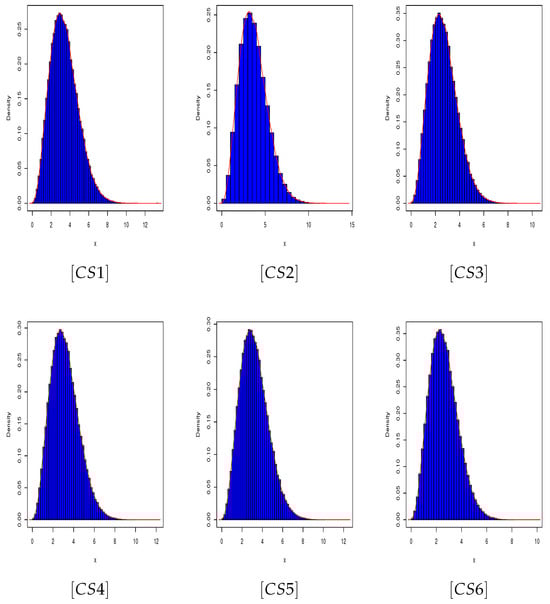 For the Bayesian estimation procedures, we validate the convergence of the generated MCMC sequence of the parameter samples from the posterior distribution by using the M-H algorithm for their stationary distributions using graphical diagnostic tools, such as the trace plot, boxplot, and histogram with Gaussian density plots, as shown in Figure 4 for . The trace plot shows a random scatter around the mean (shown by a thick red line) and a fine mixture of parameter chains. The posterior distribution is almost symmetric, as seen by the boxplots and histograms of produced samples, implying that the posterior mean can be used as a reasonable Bayes estimate of the parameter . For illustration, we also present the simulated posterior predictive densities in Figure 5.