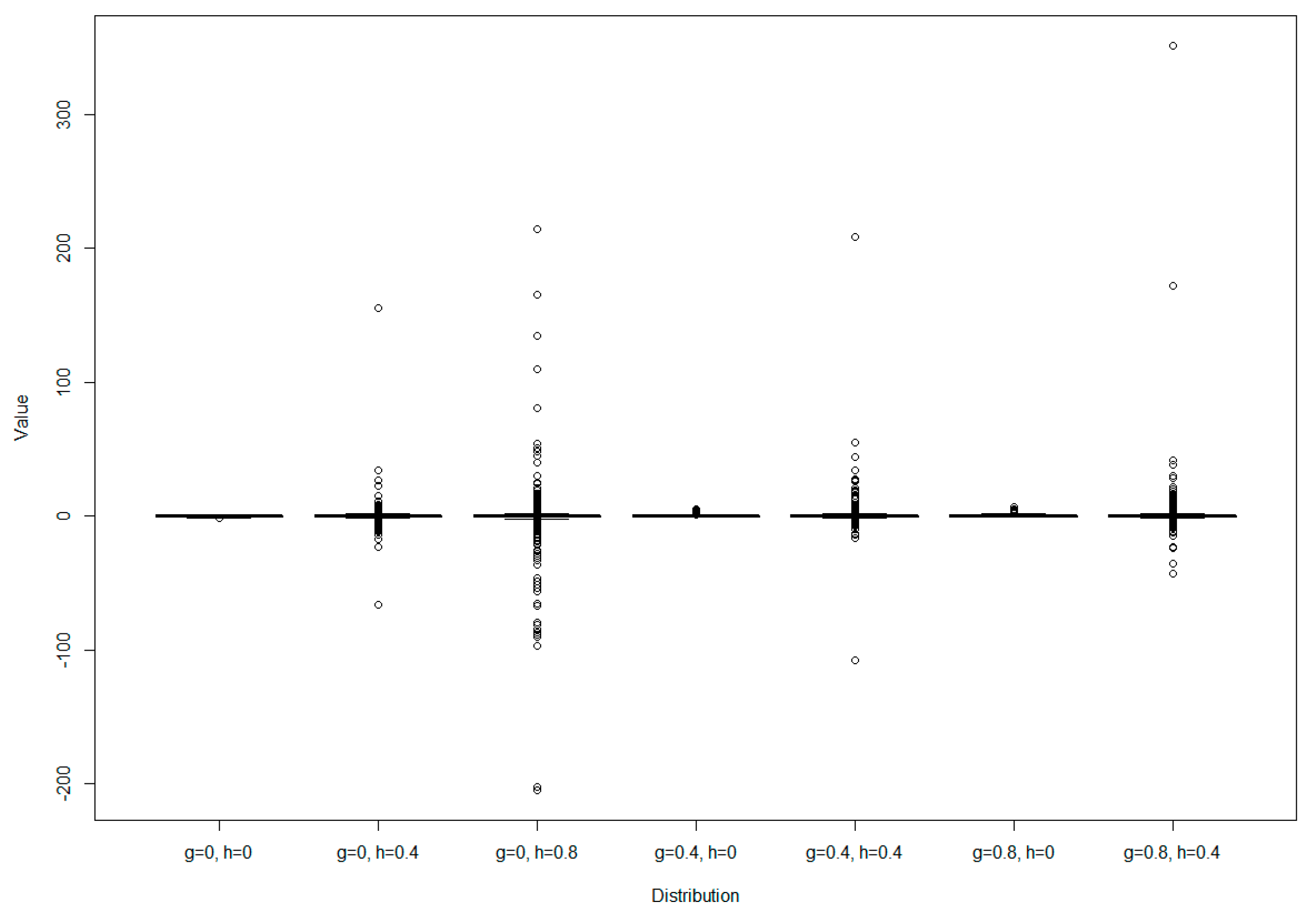 - g = 0.4, h = 0.4—Moderately skewed, moderately heavy tails;