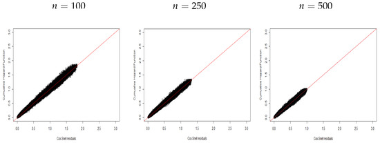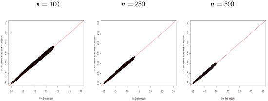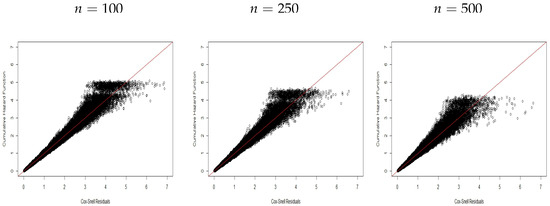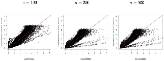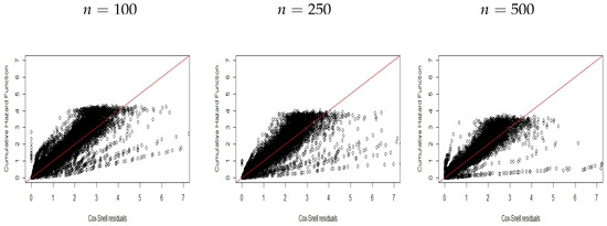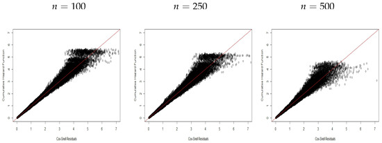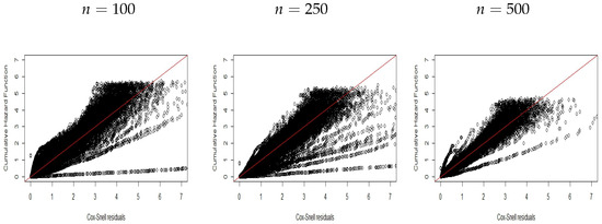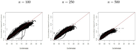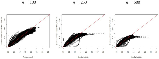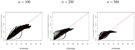 Figure 1, Figure 2 and Figure 3 display plots of the CHF versus the ordered Cox–Snell residuals for the new model without covariates (scenario ). So, we can conclude the following: