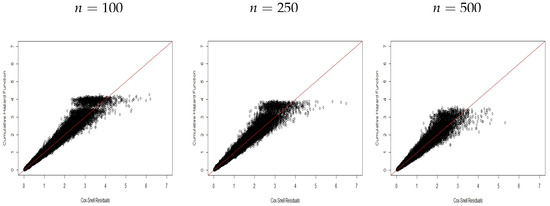 The plots below support the model assumptions. Each plot in Figure 1, Figure 2, Figure 3, Figure 4, Figure 5, Figure 6, Figure 7, Figure 8, Figure 9, Figure 10, Figure 11 and Figure 12 was prepared from 1000 replicates (under each scenario: , , , and ) based on the fact that the residuals of the replicates behave like a censored sample from an exponential distribution in the interval for susceptible individuals. Thus, we can use the plot of the CHF versus the ordered estimated residuals , where is the Kaplan–Meier (KM) survival function. Then, the expected behavior for a corrected model fit to the data follows if these plots are close to a straight line with unity slope [27].