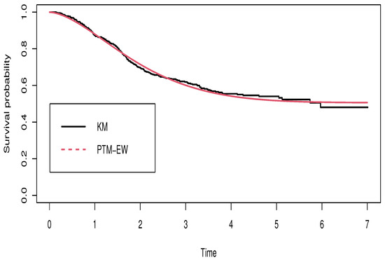 The KM and the estimated survival functions in Figure 13 reveal that the PEW model fits well to the data. The estimated proportion of cured patients is
