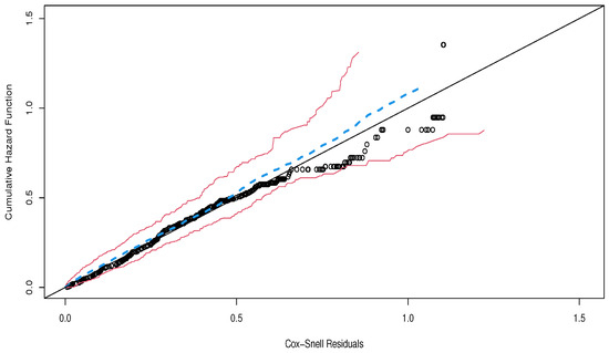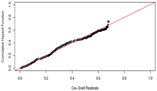 We adopted the idea of the residuals for survival analysis pioneered in [39] using a transformation of the cumulative hazard function (CHF) associated with the PEW regression model. For the regression models normally employed in survival analysis, the Cox–Snell residuals should behave like a censored sample from a standard exponential distribution when the fit is adequate [38]. Thus, a plot of the estimated CHF versus the ordered residuals should be near the straight line with slope one if the model chosen is correct.