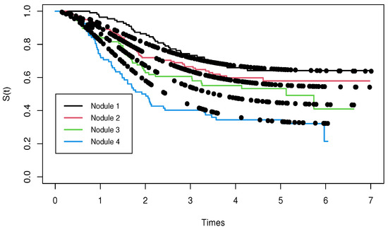 Figure 15 displays the CHF versus Cox–Snell residuals with a generated confidence envelope. The plot indicates an approximate straight line, thus showing an adequate fitted regression. Figure 16 provides the plots of the empirical and estimated survival functions for the four nodule categories, which reveal that the new regression provides a good fit to explain the time elapsed from diagnosis until death caused by cutaneous melanoma cancer.