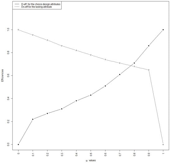 where is a design measure defined as a probability measure on the experimental region χ [4,51]. In Formula (2), we can observe a decomposition of the FIM; more precisely, the first part of the FIM, , corresponds to the coefficients for the CE attributes. Therefore, is the global FIM ( that includes both the coefficients for the CE attributes and the coefficients related to the tasting. Furthermore, the coefficient () establishes the relative weight of both objectives in the design criterion . Moreover, if the value is = 1, a D-optimal choice design for the model coefficients related explicitly to the CE part is built; instead, = 0 allows obtaining a -optimal design for the coefficient related to the tasting.