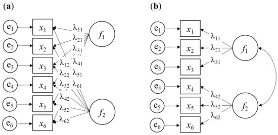 Illustration of exploratory factor analysis (EFA) (a) and confirmatory factor analysis (CFA) (b) models with six observed variables (x1, …, x6), two latent variables (f1 and f2), and specific factors (e1, …, e6). Factor loadings are denoted by λ. Constraints on factor loadings or latent variances are omitted for simplicity.