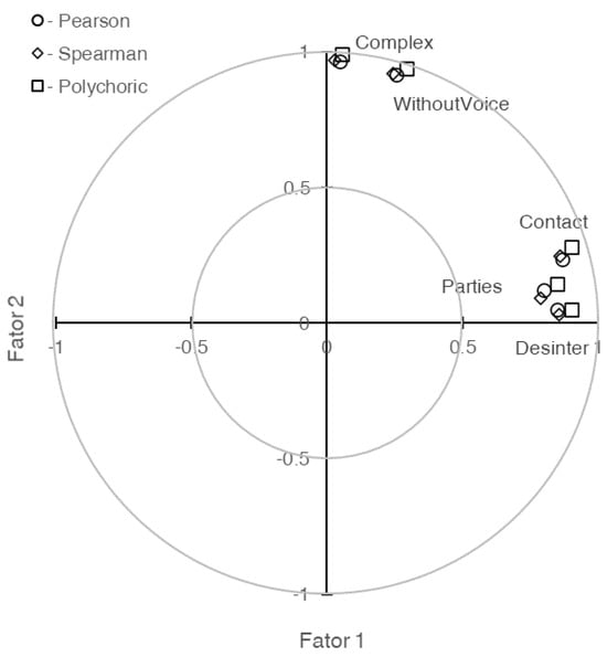 The variance extracted by each of the two retained factors is higher in the analysis conducted on the polychoric correlation matrix compared to the analyses on the Pearson or Spearman correlation matrices (59.9% vs. 53.3% vs. 51.7%, respectively, for the first factor F1; the differences for the second factor F2 are even smaller). Similarly, the factor loadings for each factor are higher when using the polychoric correlations, followed by Pearson’s and then Spearman’s correlations. These differences, often to the second decimal place, are visually depicted in Figure 2, highlighting their significance.