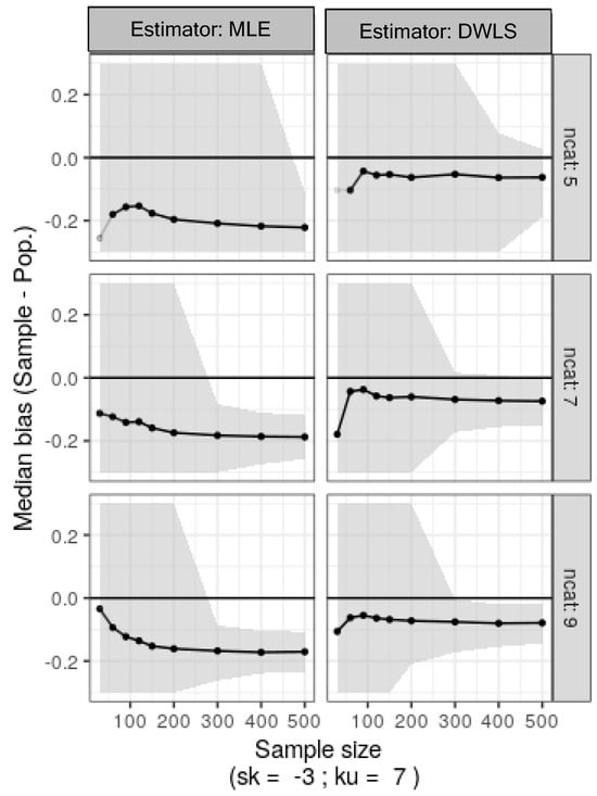 Median bias estimates for factor loadings and nonparametric 95% confidence intervals (shaded) calculated as the percentiles 2.5 and 97.5 from 500 bootstrap samples of the original skewed ordinal data with varying category counts (ncat: 5, 7, or 9) and sample sizes (30 to 500).