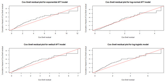 For Bayesian models, the DIC was used to compare Bayesian survival models [58]. An alternative is the WAIC [59], which assumes a more fully Bayesian approach to construct a criterion. According to [27], the WAIC is preferable to the DIC. The preferable model is the one with the lowest values of the DIC and WAIC. A lower value indicates a better fit of the model. The most common ways of checking the goodness of fit are the Bayesian Cox–Snell residual plot and predictive distribution. Model-checking and adequacy play an important role in models for survival data. In Bayesian analysis, Chaloner [60] defined the Bayesian version of the residuals.