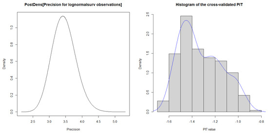 Figure 3 includes a 95% credibility interval by observing the posterior density for the parameter’s normal distribution in the HF dataset. In addition, the histograms of the cross-validated Probability Integral Transform (PIT) values show that the posterior predictive p-values are somewhat closer to a uniform distribution, with some outliers observed in the HF dataset. The Conditional Predictive Ordinate (CPO) values are significantly smaller (order of magnitude smaller) than the others, so the observed values would be considered surprising concerning the Bayesian log-normal shared gamma frailty model because the sum of the observations associated with failure flags is equal to zero in the HF dataset. The KLD is a diagnostic that measures the accuracy of the INLA approximation since Table 3 shows that the KLD values for all significant parameters in the Bayesian log-normal shared gamma frailty model were 0.