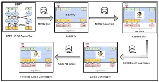 Flowchart showing the specialized Judicial CamemBERT pretraining and finetuning steps. Figure partly made from that of BERT [7].