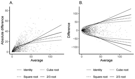 Figure 1 shows simulated data corresponding to the coronary plaque volume measurements example. Simulated data are used to increase the sample size to promote comparison of the models. The left panel A presents linear regression of the absolute difference against the average (Identity); square root of the average (Square root); cube root of the average (Cube root); and the 2/3 root of the average, with the corresponding LoA in panel B. The identity seems to be too narrow for low values of the average and too wide for large values of the average. The opposite is seen for the square root and cube root, and both methods produce LoAs exceeding times the average range for small values of the average. The 2/3 root seems to give reasonable LoAs, but it is not clear from panel A why this function of the average should produce better LoAs. The residual standard deviation for the identity is 9.4; for the square root it is 8.9; for the cube root 9.3; and for the 2/3 root 8.8. Thus, the square root and 2/3 root have approximately the same squared distance of the observation to the mean line in panel A. It is shown below that the 2/3 root can be chosen based on a dimensionality argument for volume data, where the cube root transformation is a natural choice.