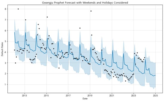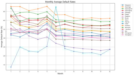 One key factor influencing default rates is seasonality [5]. Economic activity tends to fluctuate throughout the year due to seasonal factors, affecting SMEs’ ability to service their debts. For instance, post-holiday periods or economic downturns often see increased loan defaults, while other times experience lower default rates due to favorable business conditions. Seasonal effects are particularly pronounced in industries such as retail and manufacturing, which are highly sensitive to demand cycles and supply chain disruptions. Furthermore, these seasonal fluctuations can be magnified or mitigated by regional economic conditions [6,7]. In Republic of Korea, cities with distinct economic structures and industrial compositions exhibit varying default rate patterns, underscoring the need for region-specific risk management strategies [8,9]. For example, Sejong, as a government-centered administrative city, demonstrates unique economic characteristics compared to Gwangju, a region heavily reliant on manufacturing and agriculture. These distinctions highlight the complexity of designing a unified risk management framework. Therefore, a one-size-fits-all approach to managing credit risk is insufficient. Tailored risk management strategies that account for both seasonal and regional characteristics are essential for enhancing KODIT’s effectiveness [10].