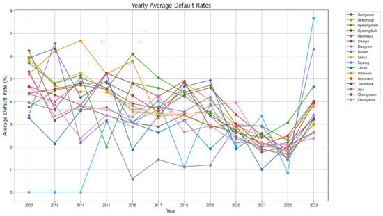 Yearly Average Default Rates across 17 regions in Republic of Korea (2012–2023). The graph shows a general decline in default rates until 2022, followed by a sharp increase in 2023, particularly in Sejong, Gwangju, and Jeonnam, likely reflecting the delayed economic impacts of the COVID-19 pandemic.