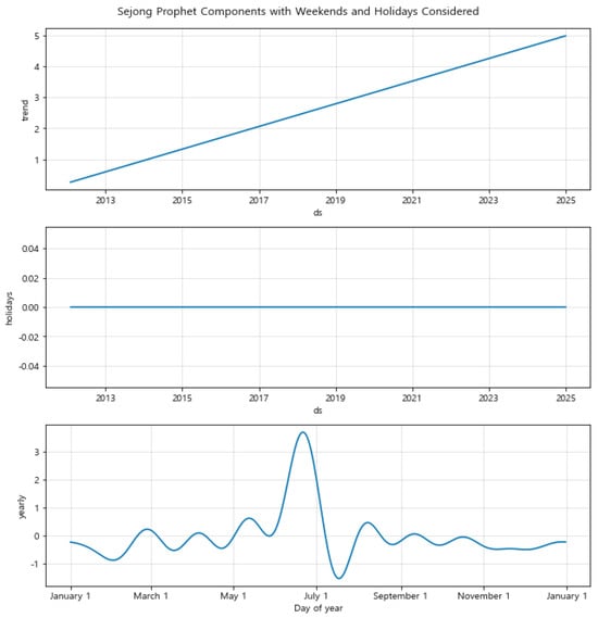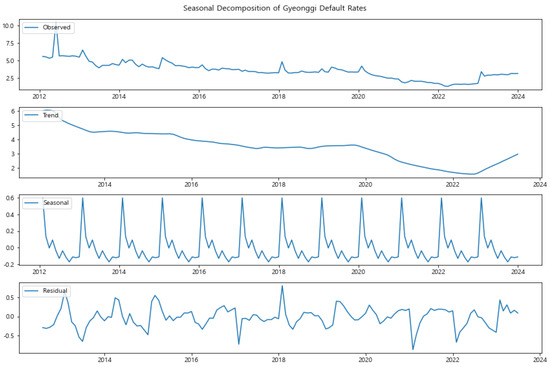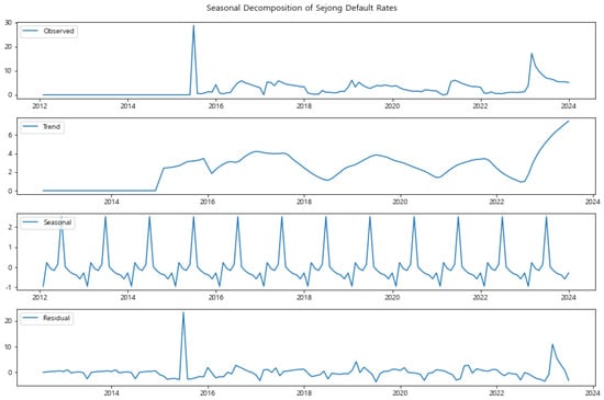 In Sejong (Figure 3), the seasonal component exhibits significant fluctuations, especially around the mid-year period. This is consistent with our earlier observation in Section 3.2.1, where Sejong displayed a unique spike in default rates during May and June, contrasting with the general trend observed in other regions. The seasonality in Sejong’s default rates suggests that local factors, possibly related to administrative cycles or region-specific economic activities, play a critical role in influencing default rates during this period. The residual component also shows occasional spikes, indicating that external shocks or non-seasonal events might have a substantial impact on Sejong’s default rates.