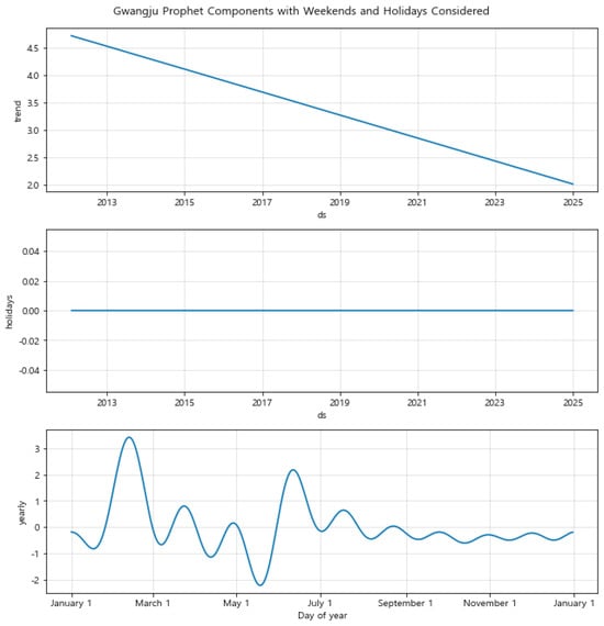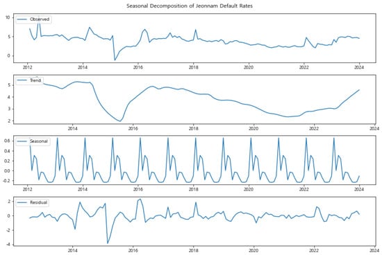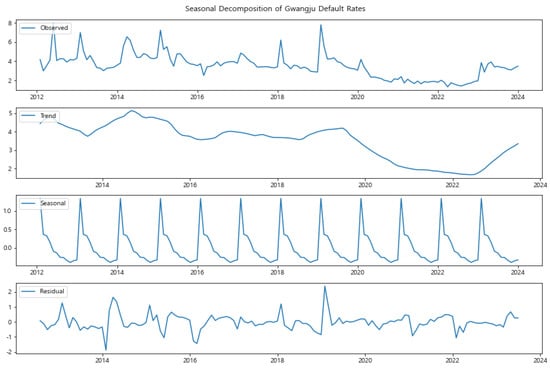Similarly, Gwangju and Jeonnam (Figure 4 and Figure 5) also exhibit distinct seasonal patterns. These regions showed a sharp increase in default rates in 2023, as discussed in Section 3.2.2. The seasonal decomposition reveals that while there is a strong seasonal component, the trend component also reflects the upward shift in default rates, particularly in recent years. This indicates that both long-term factors and seasonal influences are contributing to the heightened default risk in these regions.