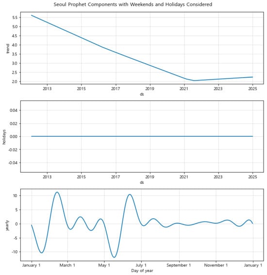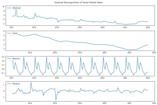 Seasonal Decomposition of Seoul Default Rates (2012–2023). While the seasonal component is present, the overall stability in trends reflects the region’s robust economic activities.