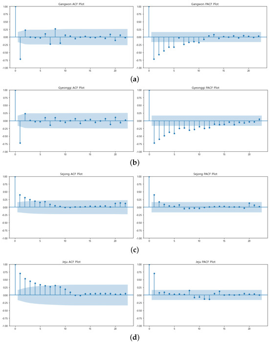 - ACF and PACF Analysis: To determine the appropriate parameters for the autoregressive (p) and moving average (q) components of the ARIMA model, we analyzed the Autocorrelation Function (ACF) and Partial Autocorrelation Function (PACF) plots for each region. Given the large number of regions, we present the analysis for several representative regions, including Gangwon, Gyeonggi, Sejong, and Jeju, which illustrate typical and atypical patterns observed across the dataset.In the case of Gangwon, the PACF plot (Figure 8a) shows a significant spike at lag 1, followed by a sharp decline, suggesting an AR(1) model (p = 1). The ACF plot shows a gradual decline, which indicates that an MA component might not be necessary (q = 0). For Gyeonggi, both the ACF and PACF plots (Figure 8b) display significant spikes at the first lag, suggesting that both an AR(1) and MA(1) model (p = 1, q = 1) may be appropriate. This pattern is consistent with other regions that have relatively stable and predictable time series behavior.
