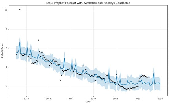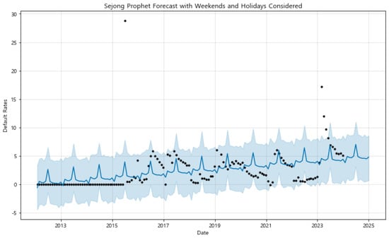 The exploration of systemic risk management and risk mitigation strategies for SMEs emphasizes the need for robust frameworks that account for both internal and external risks. However, managing risks effectively requires the ability to forecast potential financial vulnerabilities before they escalate into defaults or systemic crises. Risk forecasting models play a crucial role in this process, offering tools to predict trends, seasonal variations, and the likelihood of defaults. Building on the need for robust risk management practices, this subsection will explore various forecasting techniques that have been used in financial risk modeling, particularly in predicting SME default rates and understanding broader market trends. Several studies have highlighted the use of time-series models, including ARIMA, SARIMA, and the more recent Prophet model, to accurately forecast financial risks [16,17,18]. These models, by capturing trends and seasonality in financial data, enable institutions like KODIT to better anticipate economic downturns and make informed decisions on risk mitigation strategies.