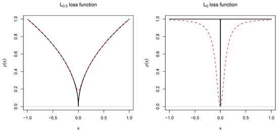 The case (i.e., the loss function) corresponds to the widely known square loss function, while (i.e., the loss function) corresponds to median regression [,]. However, the loss function is not differentiable at for . To address this, a differentiable approximation of is given by