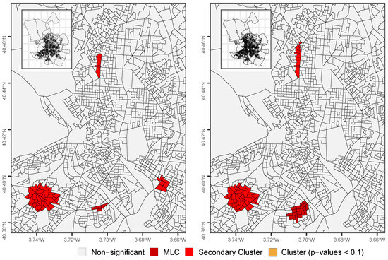 In contrast to public gambling establishments, private ones show a growing tendency to be concentrated in specific areas of the city. The scan statistic identified several spatial clusters, which increased in number and size over the analyzed period. In 2015, the MLC found only one cluster, containing 13 census tracts with a low p-value = 0.077 (Figure 1 left). In 2018, two major clusters emerged: (i) The MLC was identified, formed by 46 census tracts in the southwest of the city (around the Tetuan neighborhood). In this cluster, there were 4131 firms, out of which 25 were gambling-related, while the expected number was 8.22. (ii) A secondary cluster was also found, formed by 54 census tracts. In these 54 census tracts, there were 4339 firms, out of which 27 were gambling-related, while the expected number under the null hypothesis was 8.63. Figure 1 (right) shows the localization of the clusters. Additionally, in this year, two small clusters (C18-3 and C18-4) were identified in the north of the city, formed by nine and five census tracts, with a significance level of p-value < 0.10. Three years later, in 2021, four significant clusters were found in similar locations to those found in 2018 (Figure 2 left). The largest cluster (C21-4) remained in the same location as in 2018, and one of the small clusters with a low significance found in 2018 became significant. Finally, in 2024, three significant clusters were identified by the scan statistic (Figure 2 right), consolidating the clusters found in previous years.