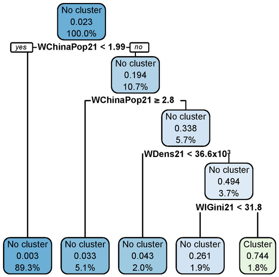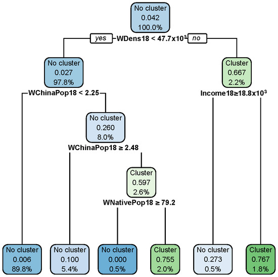 Figure 3, Figure 4 and Figure 5 illustrate the three classification trees generated by applying the machine learning tree algorithm to each of the three years analyzed. In all instances, the accuracy is very high (0.978 in 2018; 0.985 in 2021; 0.981 in 2014). The algorithm excludes some of the variables listed in Table 3, such as gender index and unemployment. This result confirms that decisions on where to locate a gambling outlet were not based on these sociodemographic characteristics in any of the analyzed years. On the other hand, the algorithm prioritizes variables such as Dens, ChinaPop, NativePop, and Income. In nearly all cases, spatial lags (WX) determine whether a census tract is classified as either part of a cluster or not.