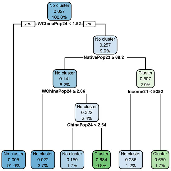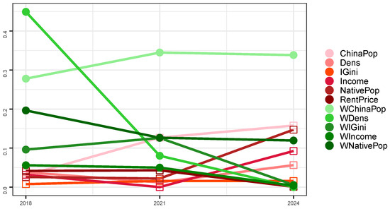In 2018, the spatially weighted population density (WDens18) was the initial variable, reflecting the importance of the surrounding environment in terms of the general population density for cluster formation. By 2024, the spatially weighted Chinese population (WChinaPop24) became the primary variable, highlighting a shift toward more specific demographic factors in the immediate neighborhood.
