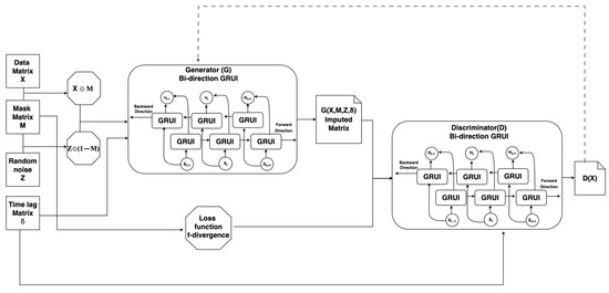 Our goal is to impute the missing values in the incomplete matrix using a generative adversarial network-based method, with the input of , a random noise matrix , a mask matrix , and a time-lag matrix . Next, we will discuss our f-divergence-based bidirectional deep generative adversarial imputation network (tf-BiGAIN) for the imputation of missing values in the time-series data.