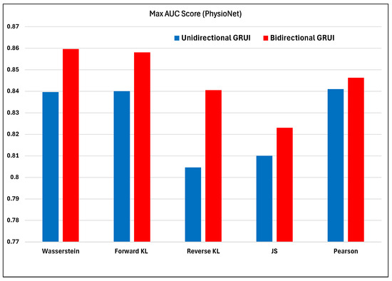 Figure 3 illustrates the AUC scores for mortality prediction using the PhysioNet data from one experimental run. The prediction model is based on an RNN classifier trained on unidirectional and bidirectional GRUI-based generative adversarial imputation networks with various f-divergence functions, including forward Kullback–Leibler (KL), reverse KL, Jensen–Shannon (JS), Pearson, and Wasserstein divergence as the adversarial loss. These results demonstrate the performance of unidirectional and bidirectional GRUI-based GANs with different f-divergence functions in the imputation process. In the unidirectional GRUI-based results, the forward Kullback–Leibler (KL) and Pearson divergence yield the best performance, with AUC scores exceeding 0.84. Luo et al.’s results [25] show that their method performs second best to forward KL and Pearson divergence, which suggests that the choice of adversarial loss function significantly impacts the prediction ability of the model. This finding underscores the importance of selecting an appropriate f-divergence for optimizing the imputation model’s performance.