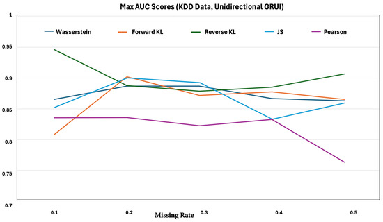 Next, we apply both unidirectional and bidirectional GRUI-based f-divergence-based generative adversarial imputation methods to impute the air quality data from the KDD CUP Challenge 2018 and predict whether the air is polluted or not. Figure 4 presents the AUC scores for pollution prediction using unidirectional GRUI-based imputation methods across varying missing rates from one experimental run. To simulate missingness, we randomly remove data points at specified proportions. Our results show that, within the unidirectional GRUI framework, most divergence functions achieve comparable performance in missing value imputation; specially, the forward KL and reverse KL divergence consistently achieve the best performance, outperforming Luo’s method [25], even at high missing rates. These findings demonstrate the robustness and flexibility of f-divergence in imputing missing data and enhancing prediction accuracy under challenging conditions.