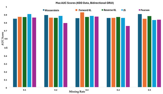 Figure 5 illustrates the AUC scores for pollution prediction achieved by the bidirectional GRUI-based generative adversarial imputation method using various f-divergence measures across different missing rates. Table 2 provides the mean AUC scores and their standard errors for different divergence measures and missing rates, based on five experimental runs. The results demonstrate that, within the bidirectional framework, the imputation methods exhibit strong robustness to varying missing rates, with most f-divergence measures delivering excellent prediction performance. These findings highlight the bidirectional approach’s ability to effectively utilize information from both past and future observations, thereby enhancing the model’s capacity to impute missing values and predict outcomes accurately.