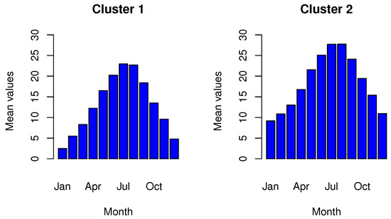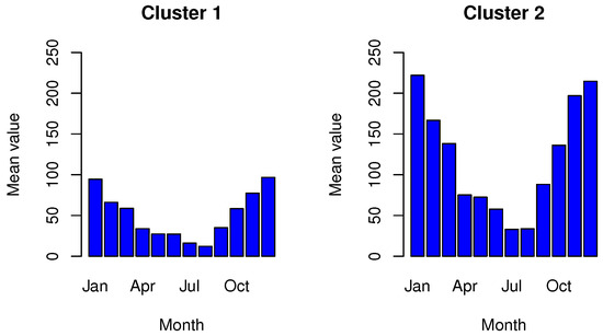Considering the average silhouette width, the optimal number of clusters is found to be equal to two for both cases (Figure 1 and Figure 2). The Davies–Bouldin index leads to the same optimal number as well. Regarding the first case, i.e., the case of the precipitation data, the first cluster consists of 313 stations. The rest of the stations (57) are assigned to the second cluster. Figure 3 presents the mean seasonal indices for these two clusters under the initial case concerning the precipitation. From the figure, it is clear that the first cluster consists of areas of lower rainfall in all months. For further insights on the clusters, the boxplots of the monthly seasonal indices are presented in Figure 4.