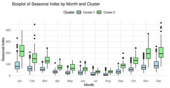Boxplots of the monthly seasonal indices for both clusters of the 2nd case.