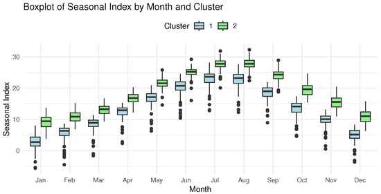 The first cluster of the case with the mean temperature data consists of 96 stations, while the second consists of 274 stations. In Figure 5, the corresponding mean seasonal indices for these two groups are presented concerning the second case of the mean temperature, while in Figure 6, the boxplots of the monthly seasonal indices are depicted. In addition, for both cases, plots of average silhouette width per cluster for this level of clustering are provided in the Appendix C.2.