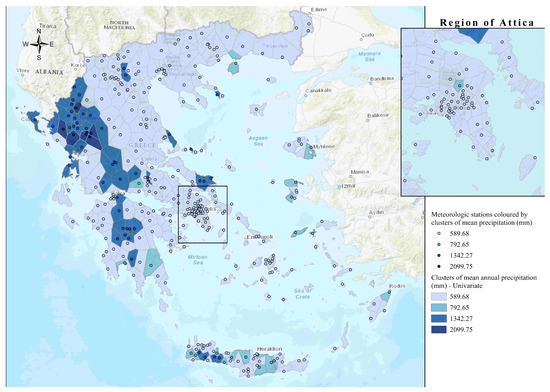 The first level of clustering, using both meteorological features, identifies two climatic regions determined by orography and the passage of depressions from the west, i.e., the Pindos mountain range, extending from the NW edge to the Crete island, dividing the country into two major hydroclimatic areas, the water-rich one and the semi-arid eastern ones [82]. More specifically, cluster 1 based on precipitation includes stations of medium to low precipitation rates in Eastern and Southern Greece with mean annual precipitation between 219.16 and 861.29 mm and a mean altitude of 126.52 m above sea level. On the other hand, cluster 2 includes stations of high to very high precipitation rates in Northern Greece with a mean annual precipitation between 924.42 and 2494.14 mm and a mean altitude of 741.14 m above sea level. It is worth mentioning that 84.59% of all stations are included in the “dry” cluster 1, while the remaining 15.4% of the stations are embodied within the “wet” cluster 2.