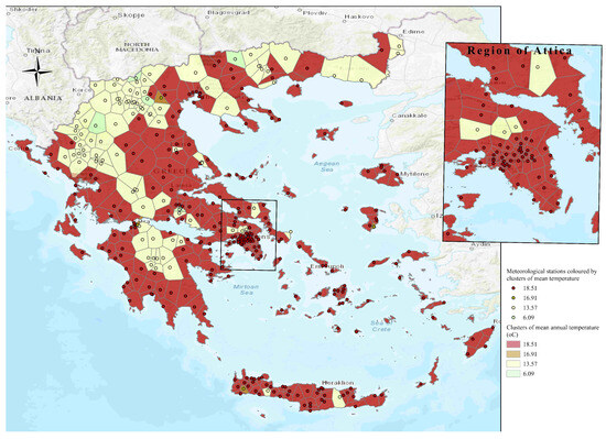 In Figure 7 are depicted the four sub-clusters regions (using Thiessen polygons) for the precipitation time series, and in Figure 8, the four sub-clusters regions for the mean temperature time series. The second level clustering divides each of the above-mentioned groups into two subgroups, resulting in four final groups of similar mean annual precipitation rates. More precisely, the previous “dry” cluster 1 includes almost the entire of Eastern Greece and most of the coastal and low-altitude regions of Western Greece. It is split into (a) a “very dry” cluster (including 92.97% of the stations of the first cluster) with mean annual precipitation of 589.68 mm, including among others the Region of Attica (the most densely populated metropolitan region of Athens) as well as Thessaloniki, the second biggest city of Greece, and (b) a “less dry” cluster (including 7.03% of the stations) with mean annual precipitation 792.65 mm including regions located in Crete, some islands in Aegean sea (e.g., Chios, Ikaria, Lesvos, Thassos, Rhodos, and Kastelorizo), and a few regions in the continental Greece (e.g., Kalamata in Messinia, Geraki in Lakonia, and Tatoi in Attica). Similarly, the previous “wet” cluster with mainly mountainous areas is divided into (a) a “wet” cluster, including 87.72% of the stations, with mean annual precipitation 1342.27 mm with regions in Western Greece around the mountainous systems extending from North to South, (Pindus, Panachaiko, Erymanthos, Chelmos, Taygetos, etc.), and (b) a “very wet” cluster, including the rest 12.28% of the stations, with mean annual precipitation 2099.75 mm, including the most rainy areas (>1845 mm) in Northern Greece, located in Epirus (i.e, Ioannina, Thesprotia, and Arta) and a small area of Evrytania.