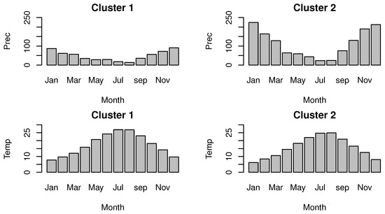 For the univariate case, the proposed methodology is applied two times: initially, to the available precipitation data and then, to the mean temperature calculated by averaging the two extreme values of the temperature. In accordance with Section 3, a clustering on the dominant features is applied and afterwards, another clustering procedure is employed, based on the secondary features and the clusters of the first-level clustering.