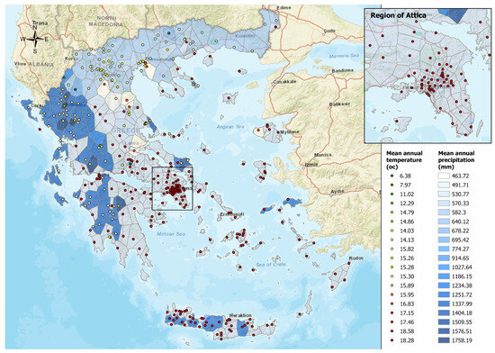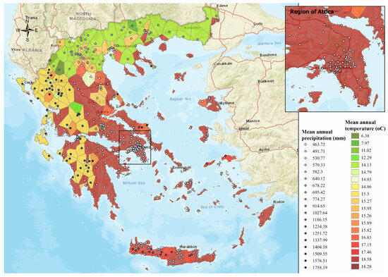 - Feidas, H.; Karagiannidis, A.; Keppas, S.; Vaitis, M.; Kontos, T.; Zanis, P.; Melas, D.; Anadranistakis, E. Modeling and mapping temperature and precipitation climate data in Greece using topographical and geographical parameters. Theor. Appl. Climatol. 2014, 118, 133–146. [Google Scholar] [CrossRef]