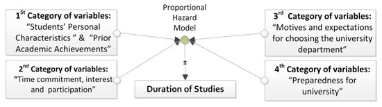 This paper supposes that the duration of studies, considered as the dependent variable, is related to four categories of variables, as briefly shown in Figure 1. For the sake of brevity, the variables included in each category, along with the coding of their values, are described below.