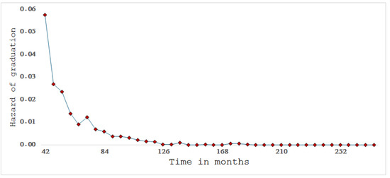 Survival analysis is a frequently used method for observing the duration between events. The basic concepts and terminology of survival analysis are as follows: We consider T as a random variable that represents survival time, in our case, the duration of studies. Then, the survival distributions of T can be described by four functions, which for the purposes of this study express graduation probabilities, as follows: We define f ( t ) as the graduation probability density function and F(t) as the cumulative graduation density function. The survivor function is S ( t ) = 1 F ( t ) , defined in our context as the probability that a student has not graduated, immediately past time t. Then, we define the hazard function as h ( t ) = f ( t ) / S ( t ) as the instantaneous graduation rate or, (see Figure 2) in other words, as a measure of the likelihood that a student graduates at time t, given that the specific student has been studying at university until time t   [22].