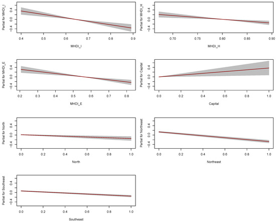 There is a strong negative association between MHDI_E and PBNVS. This suggests that improvements in local educational attainment are consistently associated with lower levels of electoral disengagement. On the other hand, the health-related component (MHDI_H) exhibits a generally positive effect, indicating that municipalities with better public health infrastructure may display higher rates of blank and null voting. This relationship may reflect underlying behavioral or institutional phenomena, such as protest voting or political disaffection in areas with relatively higher access to public services.