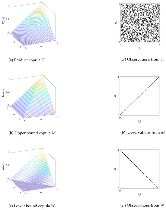 Another significant aspect concerning copulas is the ability to ascertain the proximity to the PQD, NQD, and independence. As we have seen, a uniform distribution on of observations from indicates independence. Therefore, a departure from uniformity indicates some type of dependence. The maximum deviation from independence can be established by applying Sklar’s theorem (1) to the Fréchet–Hoeffding bounds [34,35] for bivariate joint distributions: