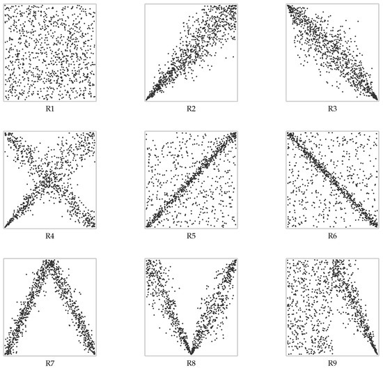 Examples of rank plots associated with the guideline cases in Table 1. R1 (independence), R2 (PQD), and R3 (NQD). Convex linear combinations: R4 (PQD + NQD), R5 (independence + PQD), and R6 (independence + NQD). Gluing copulas: R7 (PQD|NQD), R8 (NQD|PQD), and R9 (independence|NQD).