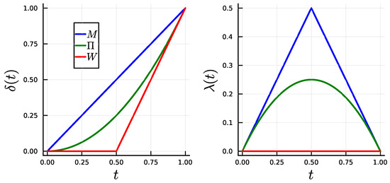 for , where and represent the main and secondary diagonal sections of W, respectively. Similarly, and are diagonal sections of M. Figure 4 shows these bounds, together with the diagonal sections from the independence copula, which are and . In cases of PQD (X, Y), we have and Likewise, for NQD , we have and If there is a crossing between and and/or between and , then there would not be a PQD or an NQD, and the crossing point could be a gluing point of two copulas, as described in (11).